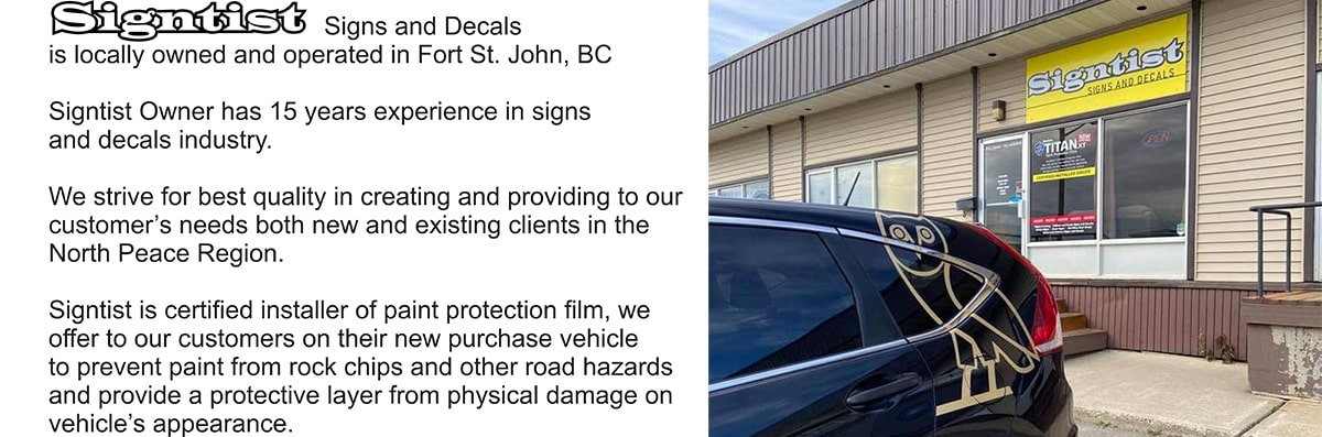 Welcome to Signtist Signs & Decals, your go-to sign shop and print shop company in Fort St. John, BC. We are a certified dealer and installer of Dura Shield paint protection film, an invisible film that gives your newly purchased vehicle an additional layer of protection from rock chips and other road hazards that can cause physical damage or harm your vehicle's appearance. We provide signs, pinstriping, banners, magnets, and dirt bike/ATV wraps, for your specific purpose and needs to bring all of your ideas to life with a personalized touch.